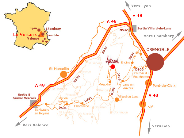 - From Lyon : 130 kms, Motorway A 48, direction Grenoble, exit Villard de Lans/Autrans (1st exit after motorway toll "péage" of Grenoble/Voreppe), direction Sassenage then Villard de Lans/Autrans by RN 532 and 531.