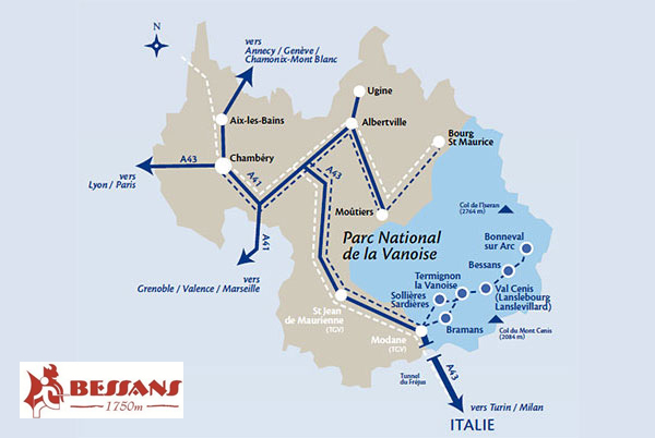 A43 motorway towards Turin, exit N°30 - Modane, then departmental road 1006 (ex-N6) towards Lanslebourg (from 10 km to go to Bramans, to 43 km to go to Bonneval sur Arc). Be careful during winter, Col de l'Iseran and Col du Mont Cenis are closed to traffic.